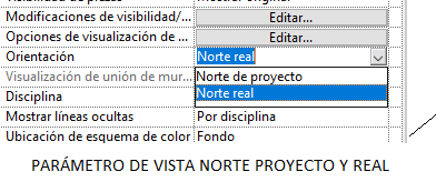 La orientación del proyecto se determina a través del parámetro de vista Orientación, teniendo como valores posibles Norte real y Norte de proyecto.
