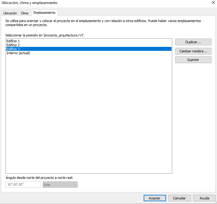 También es posible crear diferentes posiciones respecto al punto de reconocimiento. Esta opción va a ser importante cuando trabajemos con proyectos tipo campus en los que existen varias edificaciones que tienen diferentes ubicaciones en la parcela. En estos casos igualmente cada uno de los proyectos va a compartir el mismo origen de referencia pero cada uno de ellos va a tener su propia posición.