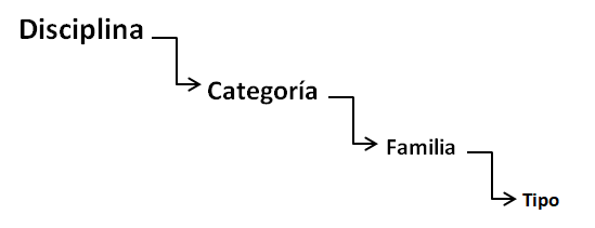 Es decir, cada una de las entidades o ejemplares que se incluyen en el modelo, ya sean muros, puertas o ventanas, pertenecen a un tipo, que a su vez pertenece a una familia, que a su vez pertenece a una categoría y que, a su vez, pertenece a una disciplina.