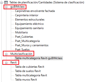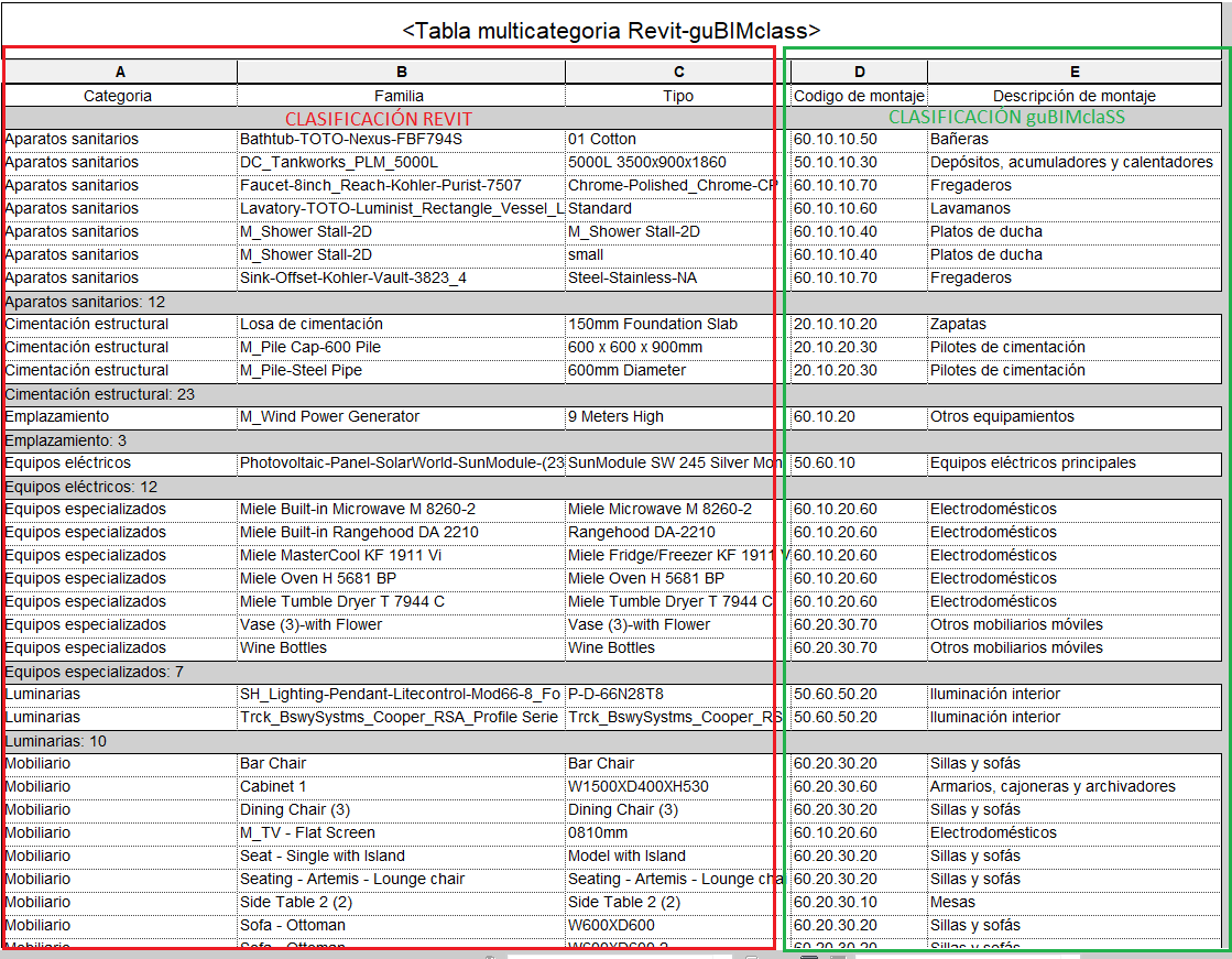 -Tabla multicategoría de Revit comparativa entre clasificación de Revit y guBIMclass. Fuente: Elaboración propia- |
