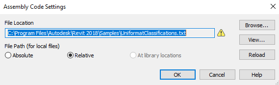 Si abrimos la herramienta de código de montaje vamos a comprobar que el archivo que carga Revit por defecto cuando abrimos alguna de sus plantillas de proyecto es el estándar Uniformat.