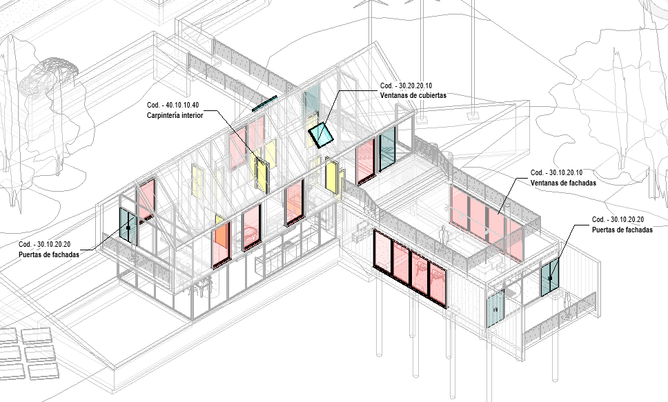 -Agrupación por colores de las carpinterías de proyecto por función en una vista de Revit. Fuente: Elaboración propia- |