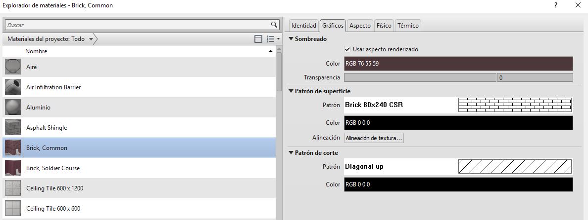 Dentro del explorador o editor de materiales tenemos todos los materiales cargados en el proyecto o plantilla en la que estemos. Cada uno de los materiales está definido por parámetros agrupados en diferentes pestañas. Una de ellas es la correspondiente a gráficos.